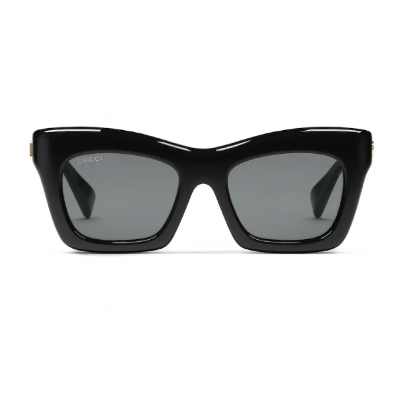 这款黑色太阳眼镜甄选光泽感醋纤材质打造而成。镜腿缀饰金色调手写体Gucci细节,令长方形镜框魅力更添,纯灰色镜片则令整个设计愈发亮眼。